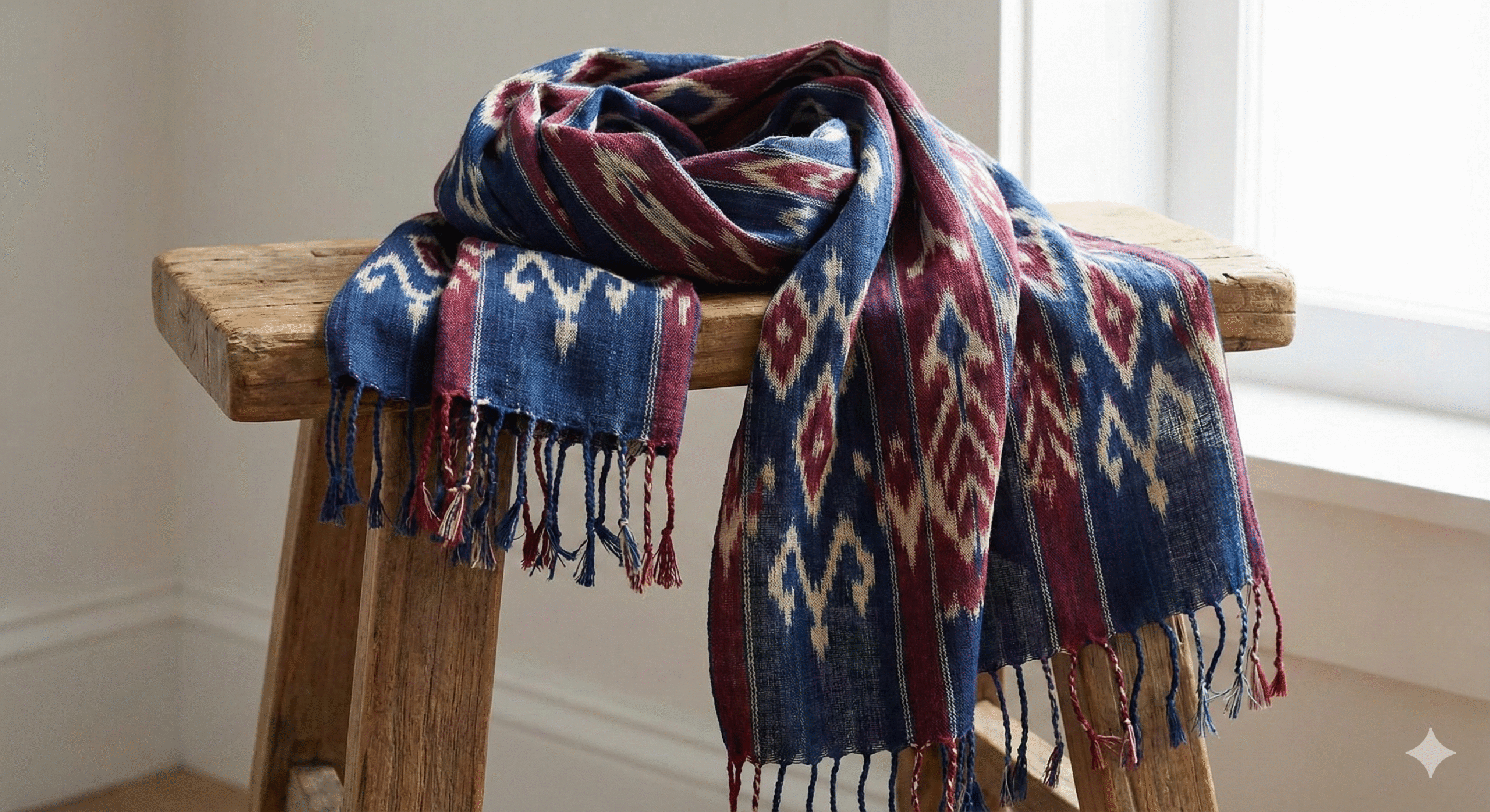 This handwoven ikat scarf features intricate patterns inspired by traditional Indonesian designs, crafted with care by skilled artisans.